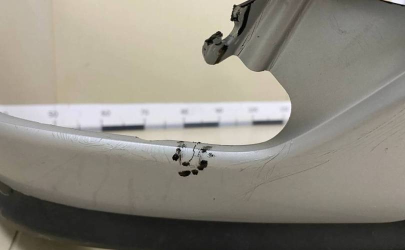 Оригинал. Под парктроники. Потертости и царапины. Небольшая трещина, повреждено одно крепление противотуманной фары