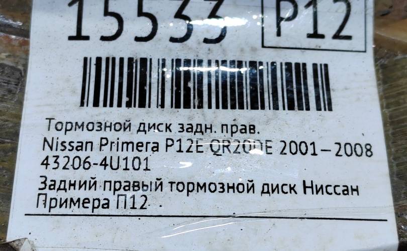 Диск тормозной Nissan Primera 2001—2008 432064U101 P12 QR20DE, задний правый