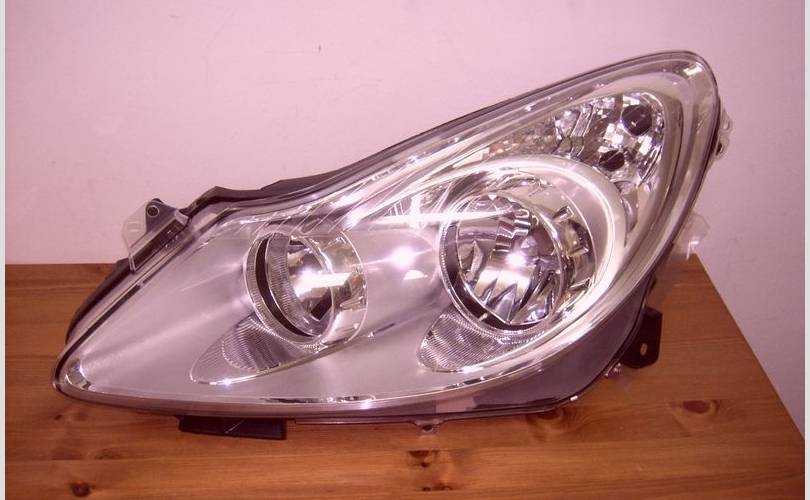 Фара хромированная (серебристая, хром, светлая) левая, новая, неоригинальная. Подходит для автомобиля Opel Corsa D дорестайлинг с 2006 по 2010 год выпуска.