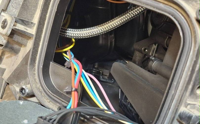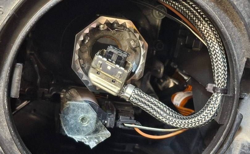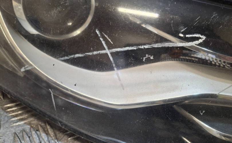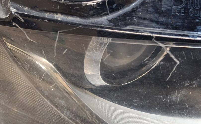 Линза, ксенон, 2 блока, диодные ДХО, сильные царапины, микротрещины, мусор внутри, нет лампы и игнитора, дефект крепления