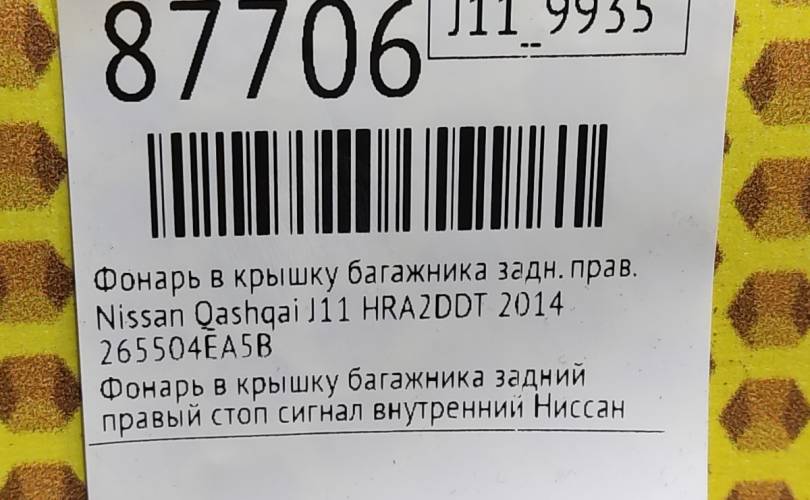 Фонарь крышки багажника Nissan Qashqai 2014 265504EA5B J11 HRA2DDT, задний правый