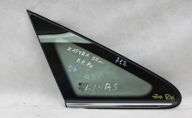 Стекло кузовное переднее правое с хромированным молдингом, AS2 - слегка зеленоватое, пропускная способность 70%, б/у оригинал, в хорошем состоянии. Подходит для автомобилей Opel Zafira B (Зафира Б) с 2005 по 2015 г.