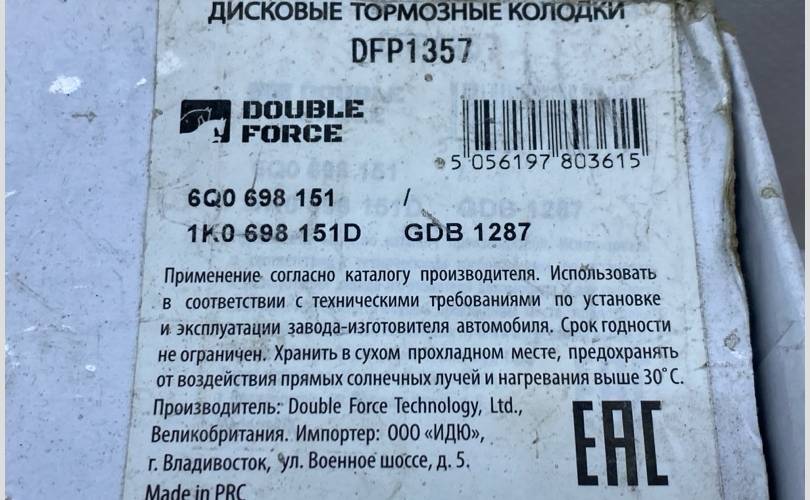 Колодки тормозные Volkswagen Golf Plus с 2008- DFP1357 1, передние