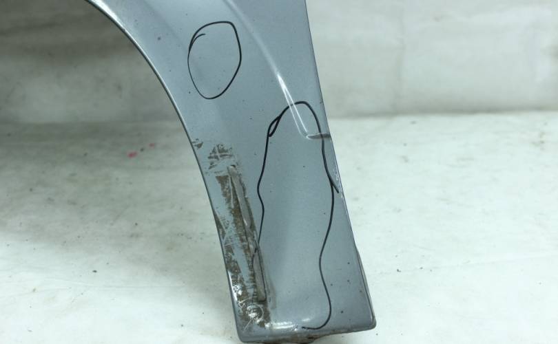Крыло переднее левое, б/у оригинал с мелким дефектом: в нижней части, ближе к порогу, две небольших вмятины (на фото отмечены черным маркером). Цвет: серый металлик. Подходит для автомобиля Opel Astra H (Опель Астра Аш, Астра Н) с 2004 по 2015 год выпуска.