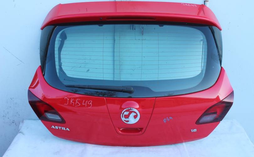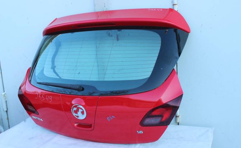 Дверь багажника (крышка, хлопушка) в сборе, б/у оригинал в хорошем состоянии. В комплектацию входит: стекло, дополнительный стоп сигнал, моторчик, поводок и щетка заднего дворника, фонари (темные, тонированные), замок, кнопка открывания багажника, обшивка. Цвет: красный. Подходит для автомобиля Opel Astra J (Опель Астра Джей) с 2009 по 2016 год выпуска в кузове 5-ти дверный хэтчбек.