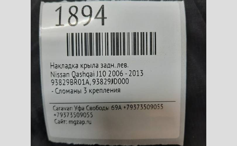Накладка крыла NIssan Qashqai 2006 - 2013 93829BR01A J10, задняя левая