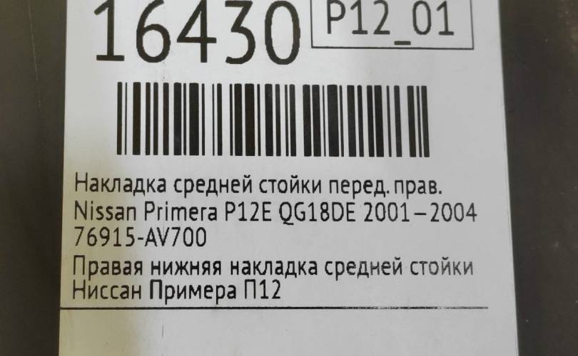 Обшивка стойки центральной нижняя Nissan Primera 2001—2004 76915AV700 P12 QG18DE, передняя правая