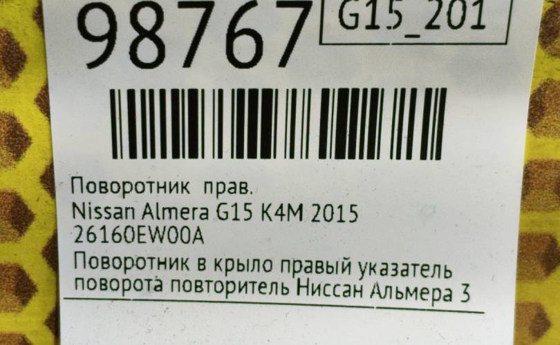 Поворотник Nissan Almera 2015 26160EW00A G15 K4M, правый