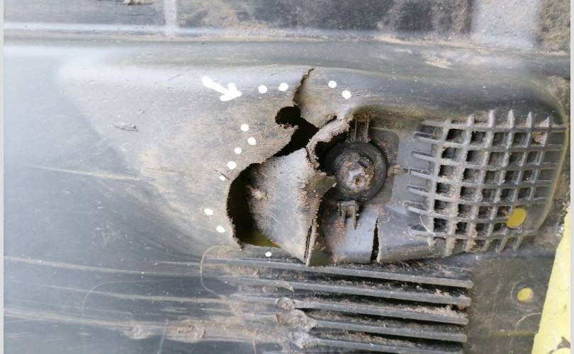 защита днища левая, пробой, трещина, вмятина
