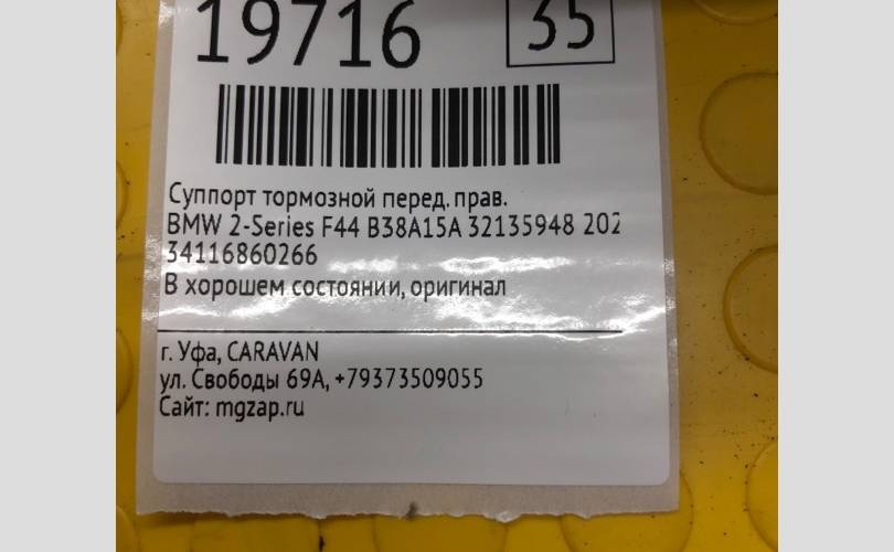 Суппорт тормозной BMW 2-Series 2020 34116860266 F44 B38A15A, передний правый