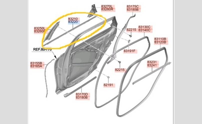 Уплотнитель опускного стекла Genesis G80 2022 83220T1001 RG3 G6DS, задний правый