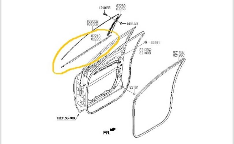 Уплотнитель опускного стекла Kia Sorento 2019 82220C5000 UM D4HB, передний правый